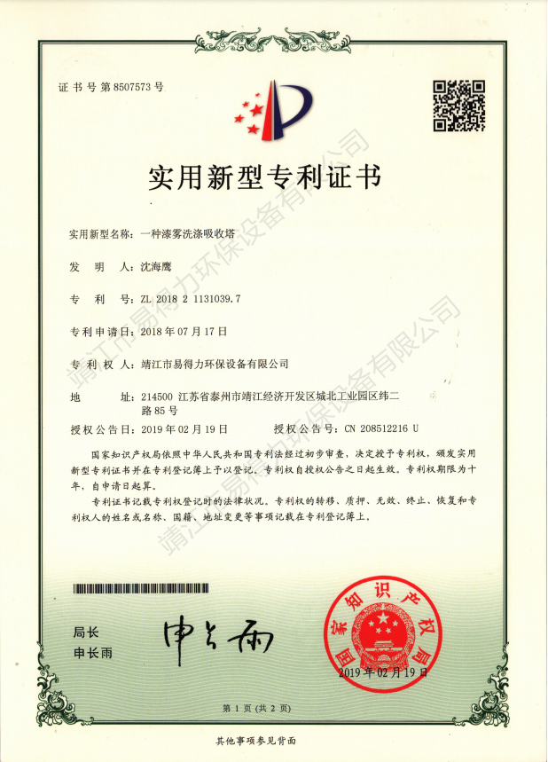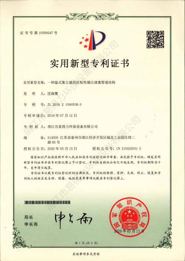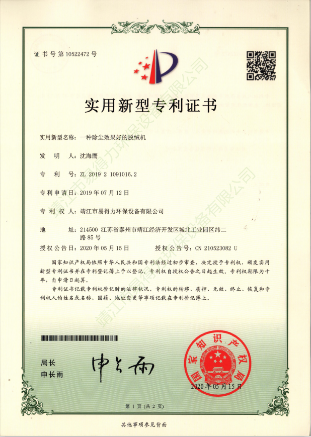 專利證書本公司坐落于開放開發(fā)超前城市江蘇靖江,我們精良優(yōu)秀設計團隊始終遵循著創(chuàng)新超越的理念,贏得了中外合資企業(yè)的信賴。易得力環(huán)保設備有限公司與上海環(huán)科院等科研單位保持合作關系,不斷加大自身的科研力量,集中了一批國內環(huán)境科技研究和應用方面的高素質人才,取得多項實用新型專利證書。…… 查看更多 >>